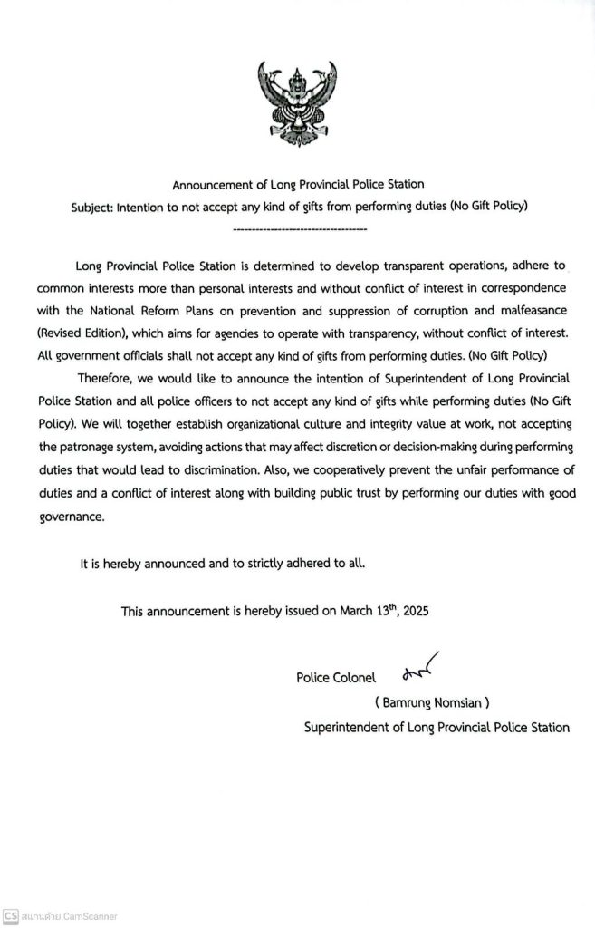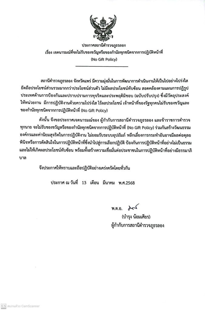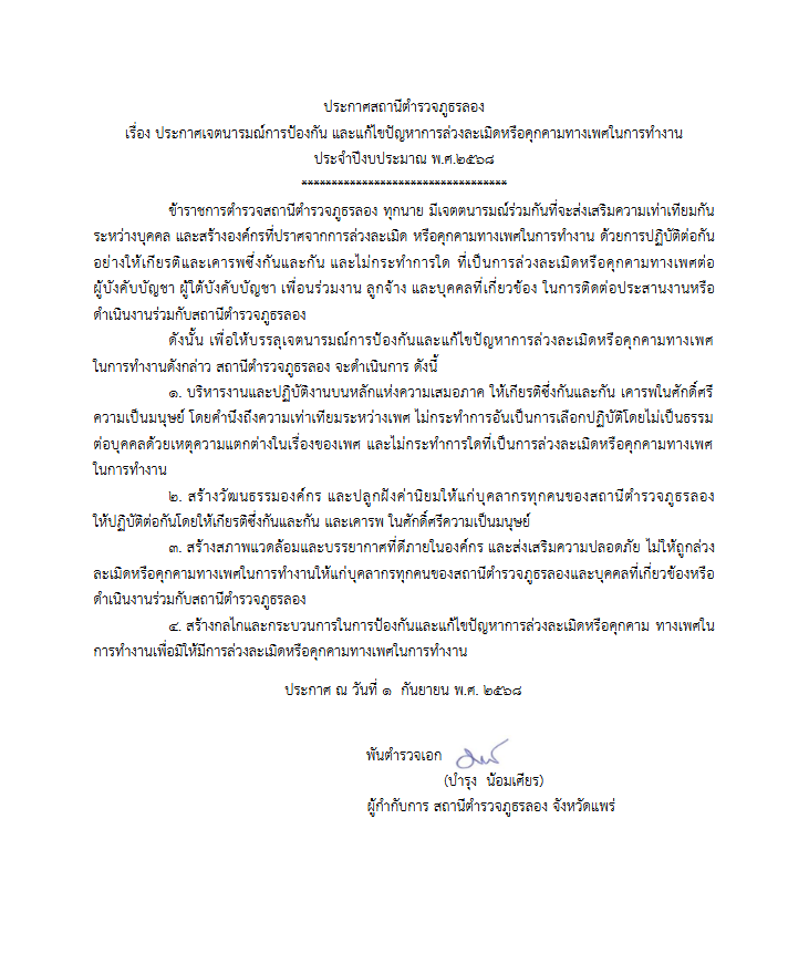 ประกาศเจตนารมณ์ เรื่อง การป้องกันและแก้ไขปัญหาการล่วงละเมิดหรือคุกคามทางเพศในการทำงานของสถานีตำรวจภูธรลอง